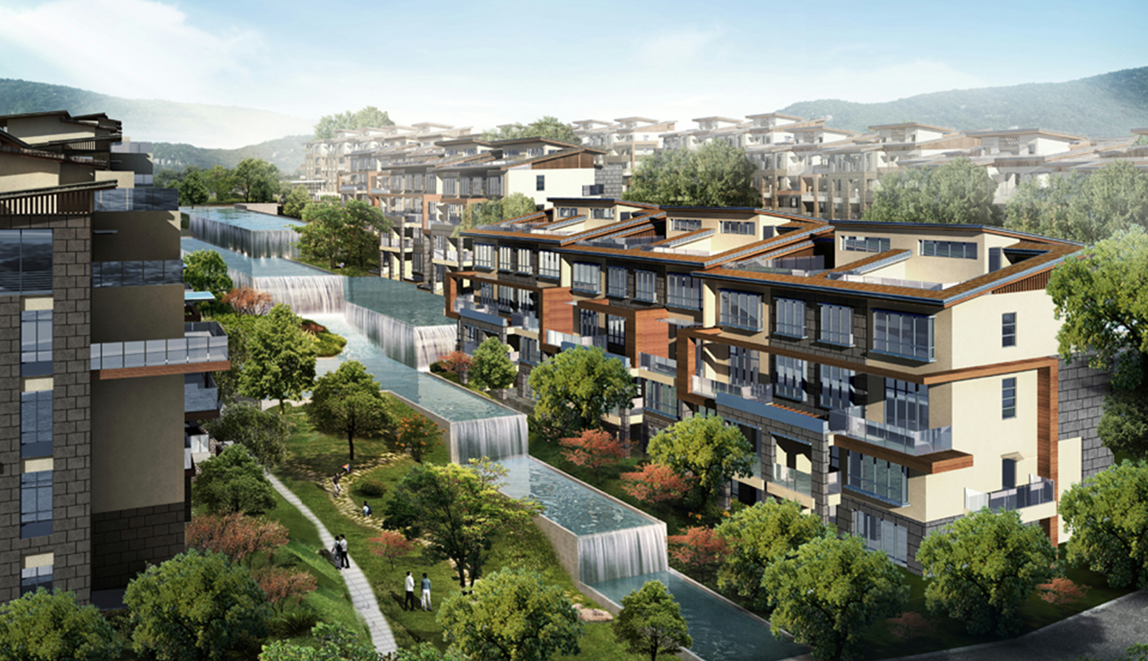 在總體的規(guī)劃設計中,設計師的靈感主要來源于項目中現存的分布于場地中央和南北地塊的數處面積不大但卻別具自然風情的水體和山頂雨水沖刷所形成的沖溝。