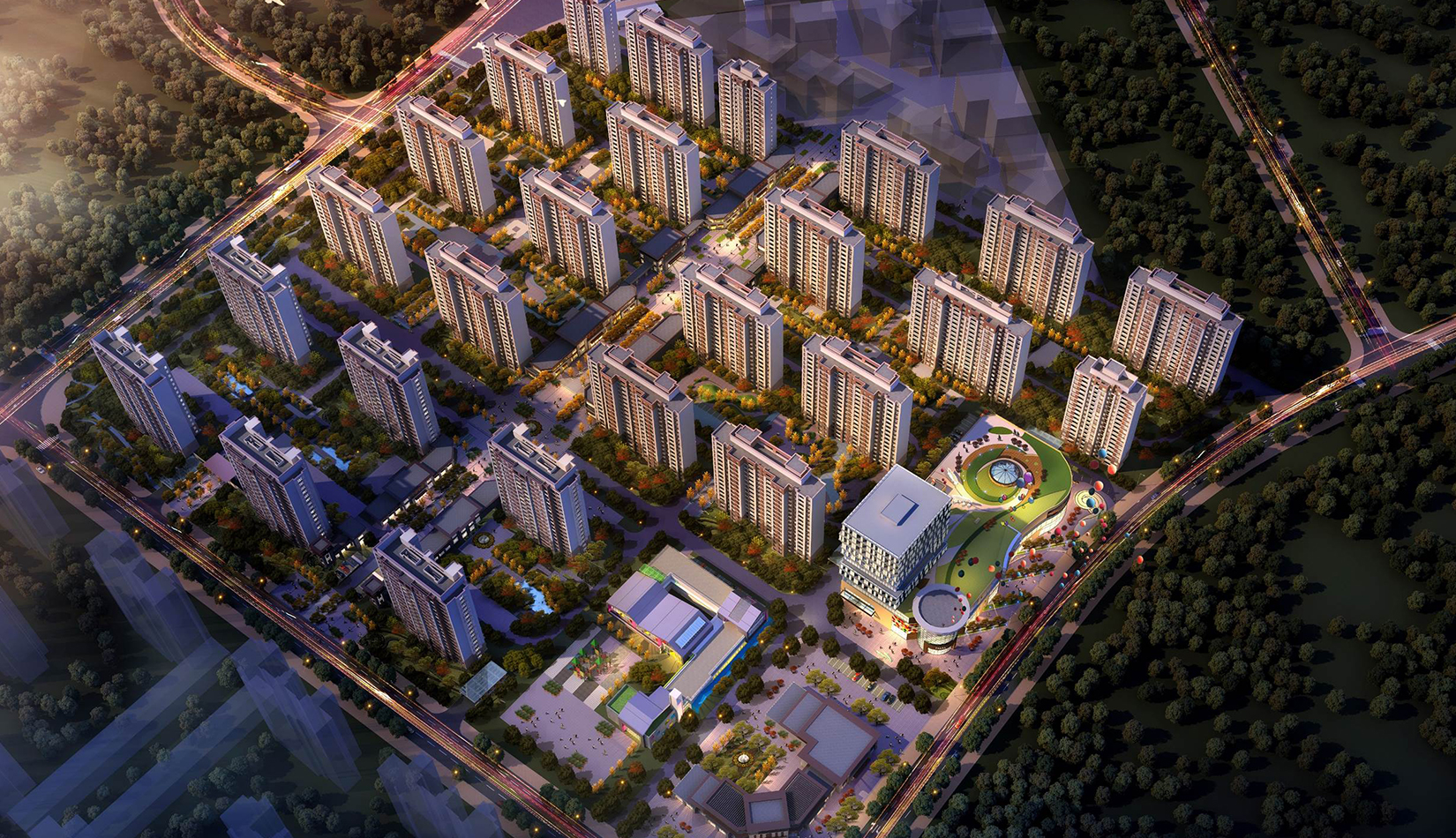 總體規(guī)劃采用街區(qū)制組團劃分,以“窄馬路、密路網(wǎng)”為設計向導,引入三條城市道路。合理劃分七個功能組團,營造宜人的居住尺度。遵循安置社區(qū)資源均好性原則,使用行列式建筑布局,符合相關日照規(guī)范。充分利用“金角銀邊”商業(yè)定理,采用集中布局與沿街布局兩種商業(yè)布局,注入更多商業(yè)街區(qū)活力。
