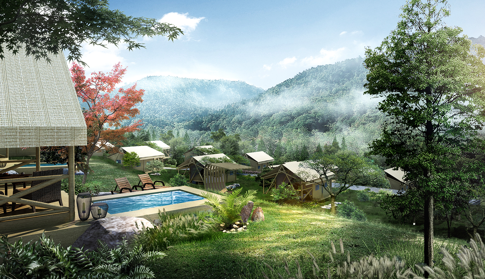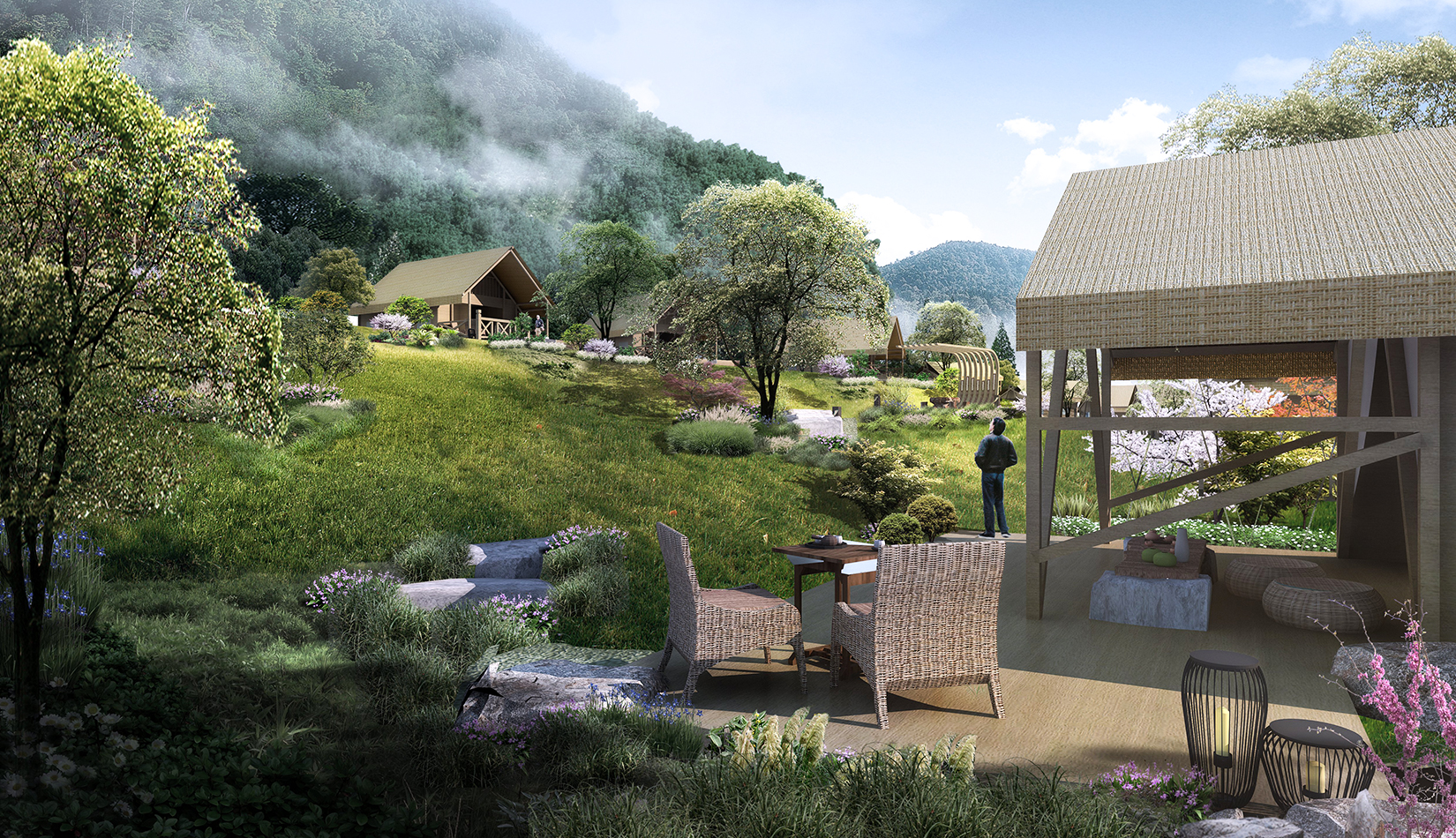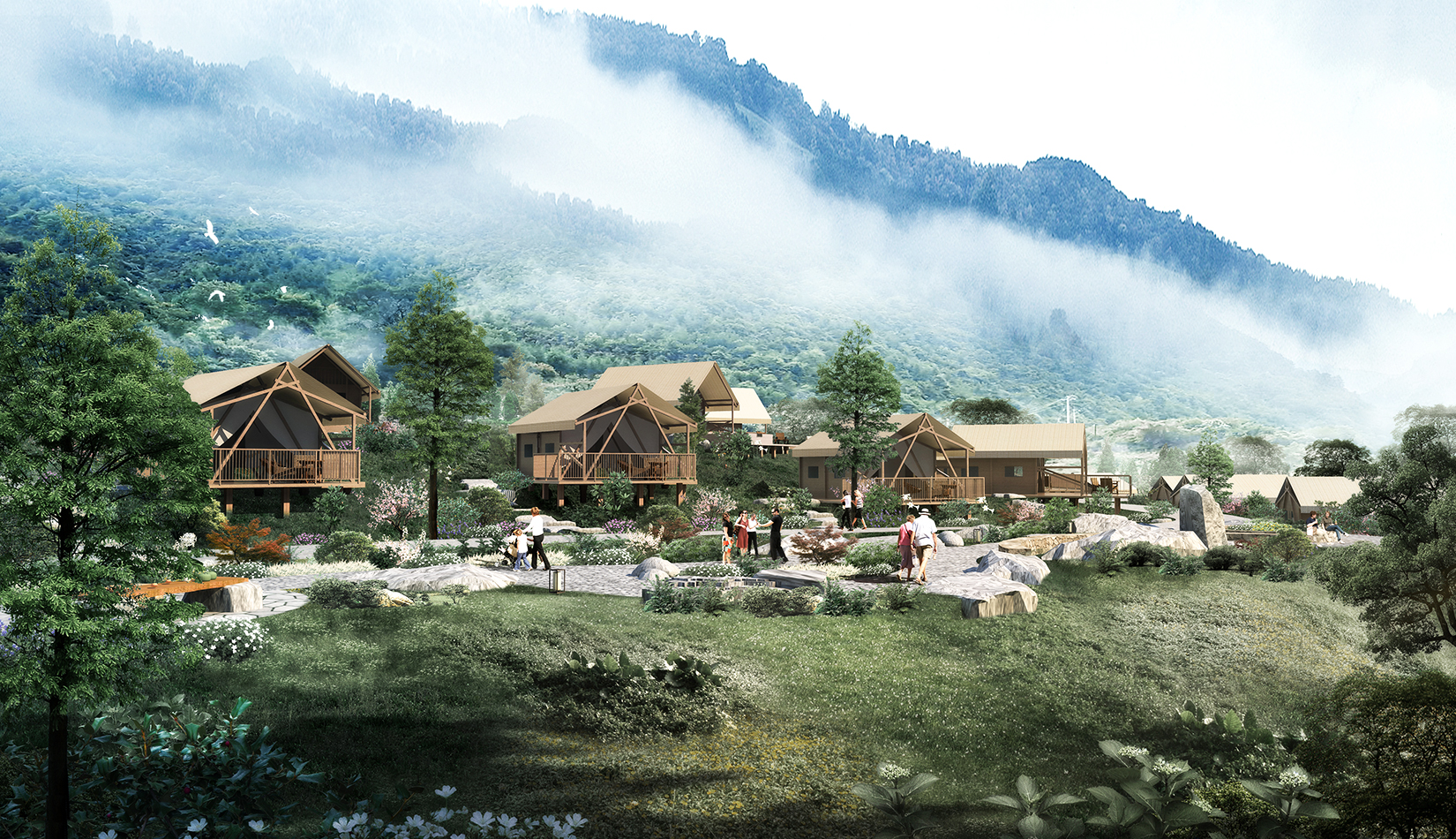 景觀設(shè)計從野奢度假酒店的“野”和“奢”兩字入手,融入荒野生態(tài)的設(shè)計理念,又要與場地相融合、與原生態(tài)相映、與當(dāng)?shù)氐拿袼罪L(fēng)情相交匯,突出當(dāng)?shù)氐奈幕黝},強調(diào)高品質(zhì)的自然、野奢度假,從而打造出一個具備個性與特色,使游客能夠享受到自然野趣體驗的景觀環(huán)境。