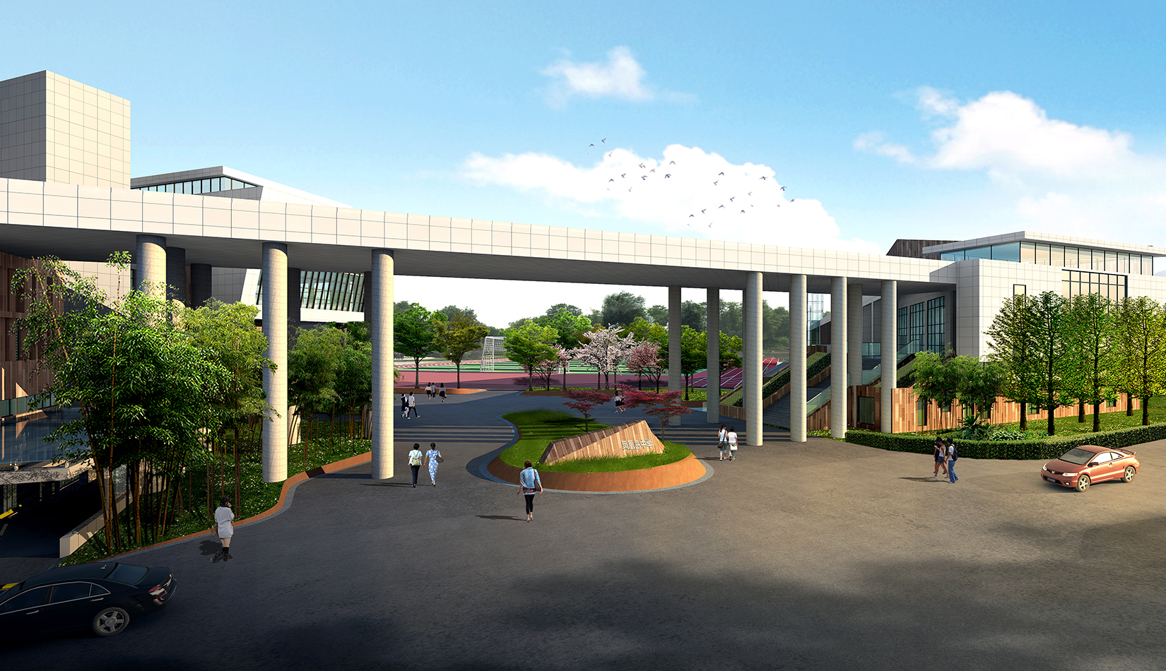 1. 將抽象化的鳳翎設計成特色種植,結合建筑形態(tài)配以流線型鋪裝設計,在鋪裝上增加鳳凰島中學校訓校風的細節(jié)設計,凸顯學校濃郁的文化氛圍以及室外景觀環(huán)境的精致。