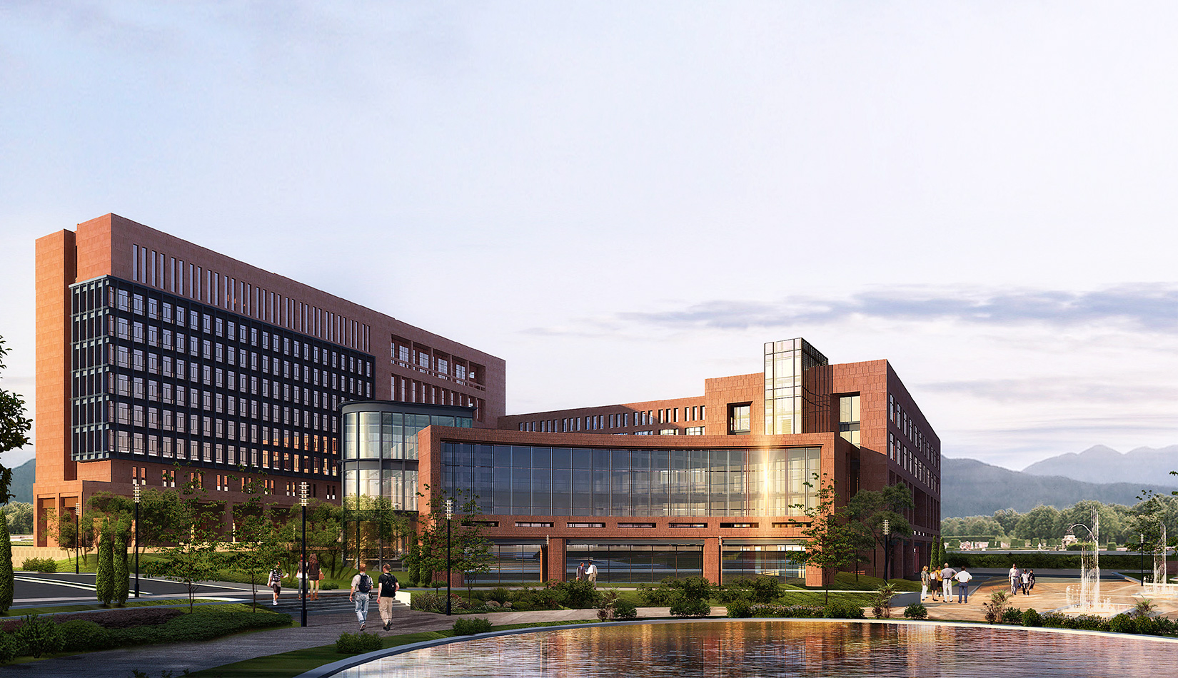 總體的規(guī)劃布局圍繞中心景觀廣場展開設(shè)計。首先從山區(qū)建筑布局師法自然,藏風聚氣的傳統(tǒng)觀念出發(fā),結(jié)合現(xiàn)代科學嚴謹求真務(wù)實的態(tài)度,設(shè)計以東側(cè)入口廣場導(dǎo)入的中心景觀空間圍合展開規(guī)劃布局,總體上根據(jù)土地的使用性質(zhì)分為四個區(qū),分別是正對主入口北側(cè)的生活區(qū),南側(cè)的孵化中心區(qū),正對主入口廣場的科研辦公區(qū),以及整個用地最南端的產(chǎn)業(yè)開發(fā)區(qū),各個區(qū)既相互獨立同時又緊密聯(lián)系,功能上即考慮主導(dǎo)風向又方便使用。