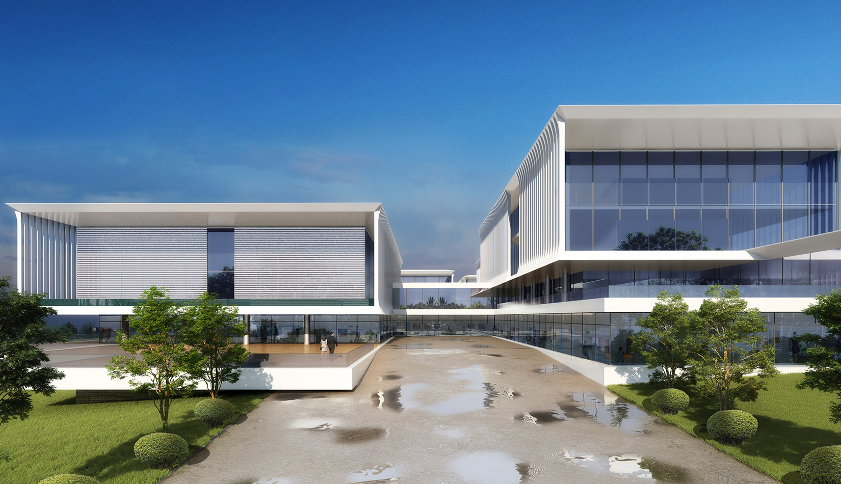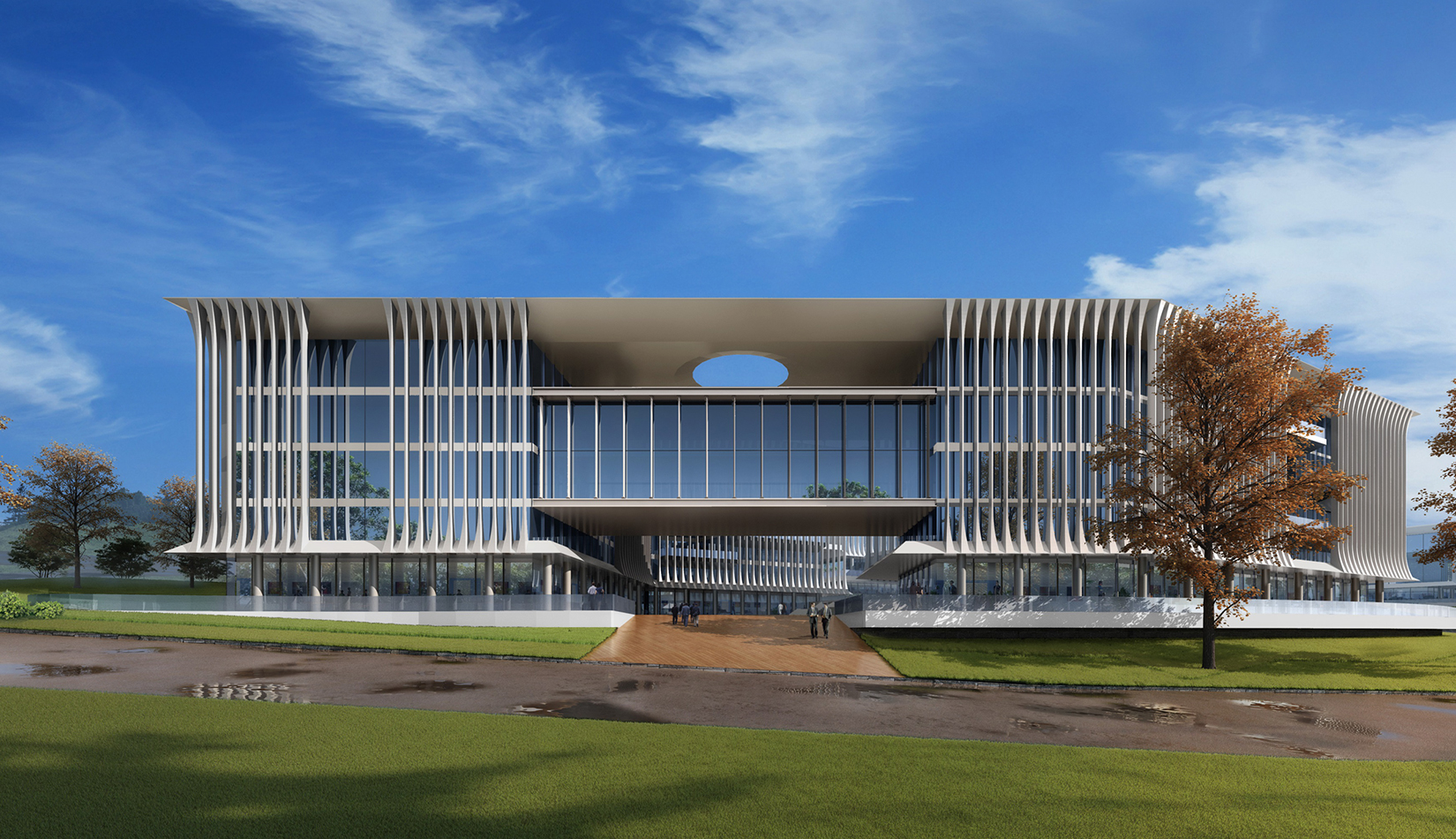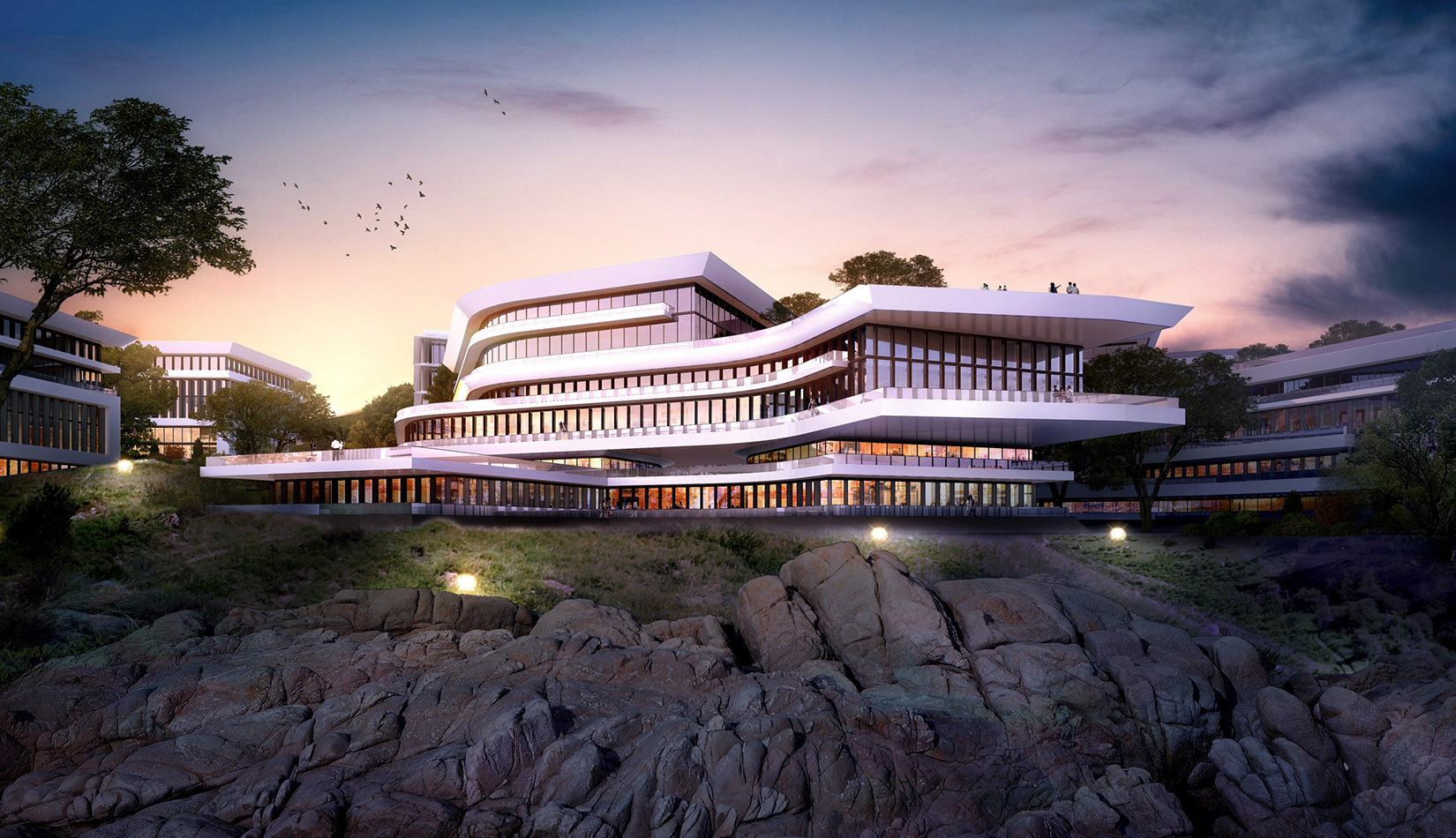 簡(jiǎn)潔大氣的豎向橫向劃分,使MECS主樓充滿海洋氣息;白色流線型屋頂順應(yīng)地勢(shì),自由舒展。流線型的體塊靠近海岸線,表達(dá)科研人員的探索精神,并且與地勢(shì)相結(jié)合。