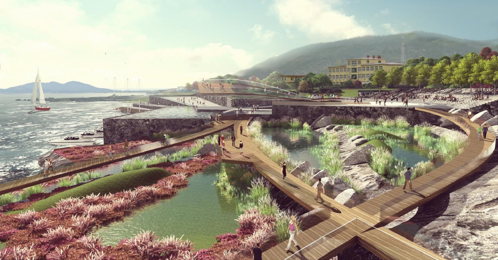 該項(xiàng)目以露天海洋科技博物館為設(shè)計(jì)理念,打造一個(gè)集生態(tài)保育、展示教育、科學(xué)科普、交流傳播、旅游觀光等功能于一體的國(guó)家級(jí)愛國(guó)主義教育基地。設(shè)計(jì)是以地域性、生態(tài)性、智慧性為指導(dǎo)原則,將整個(gè)海岸帶劃分為五個(gè)分區(qū)進(jìn)行設(shè)計(jì),包含了科研、文教、生活三個(gè)方面,重塑海洋價(jià)值觀,打造一個(gè)海洋科技交流平臺(tái)。